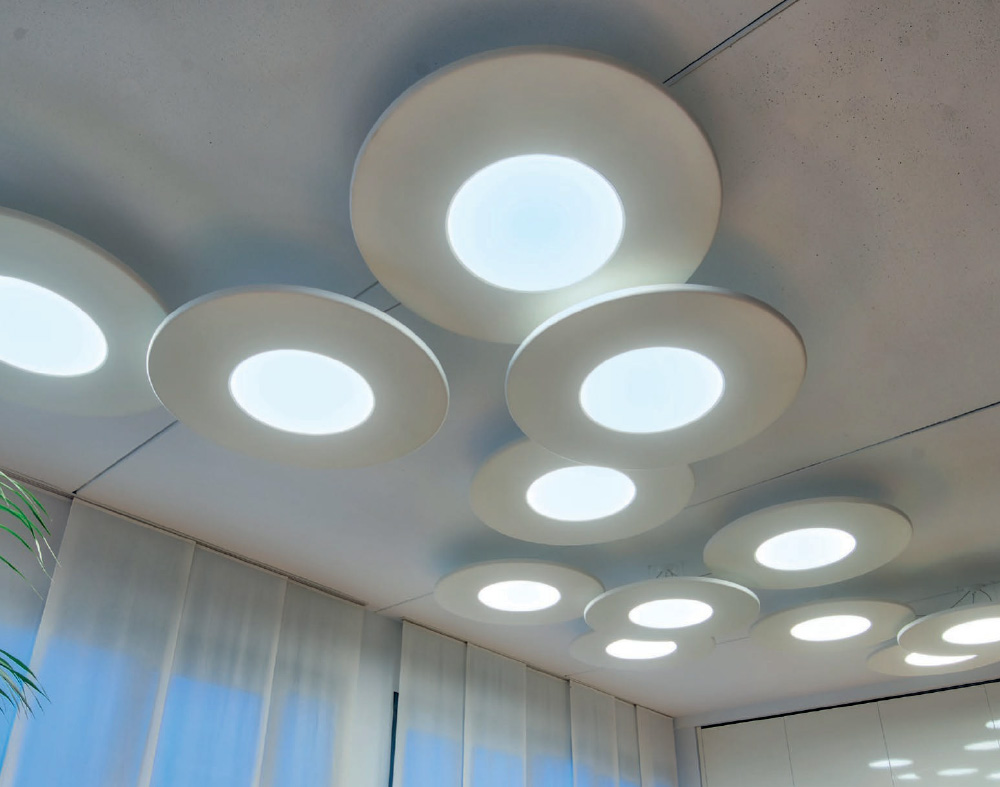 Une alternative à fort impact esthétique consiste à positionner les panneaux insonorisants au plafond, en les accrochant directement au plafond ou avec des câbles de suspension en acier réglables comme dans le cas de Preludio : de cette manière, vous pouvez également intégrer des lumières LED et des spots ou haut-parleurs, pour compléter le confort environnemental à tous points de vue.