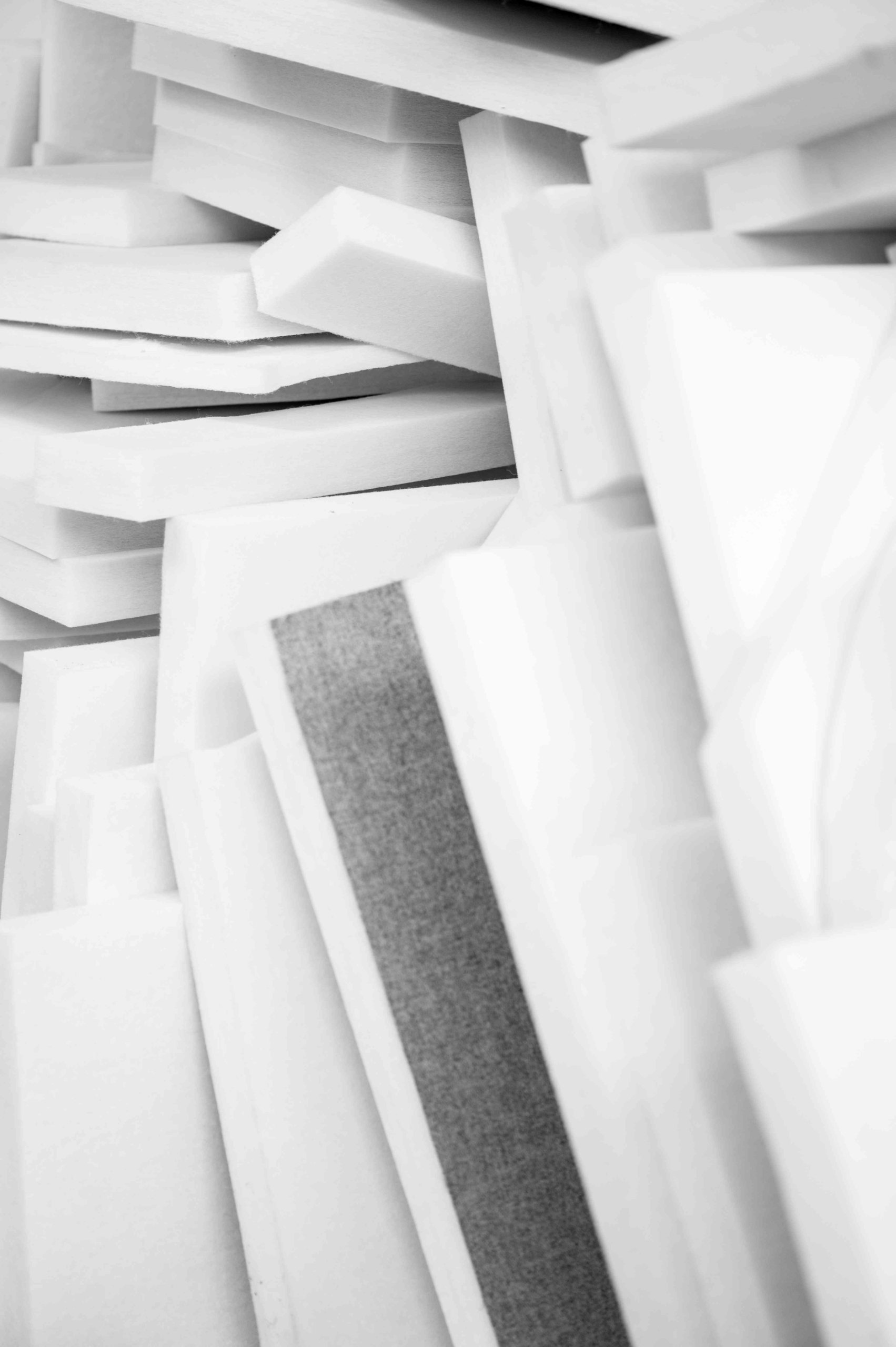 Pannello fonoassorbente bifacciale tipo baffle a soffitto o a parete in fibra di poliestere PET termolisciata e termolegata ignifuga con densità 50 kg/m3 e spessore del pannello 50 mm. I pannelli non sono dotati di rivestimento in tessuto né di struttura di irrigidimento (telaio) al fine di garantire le migliori performances acustiche