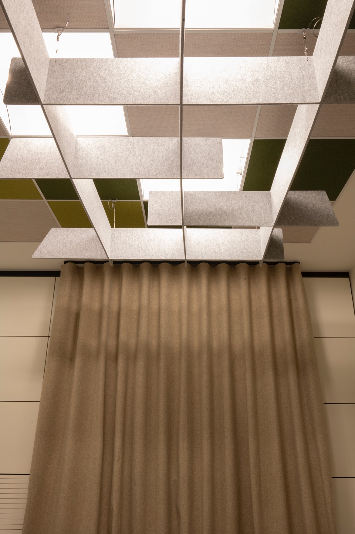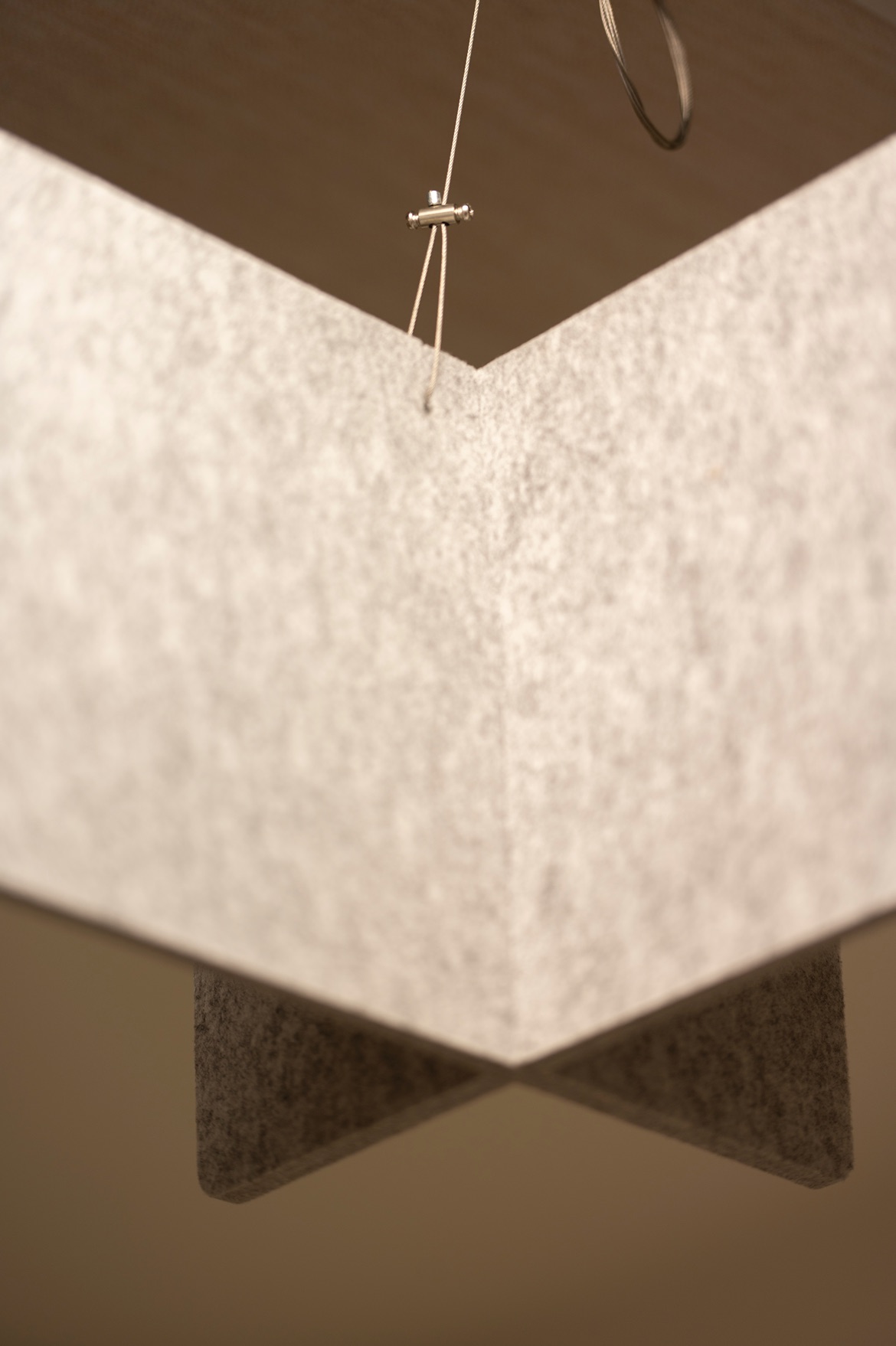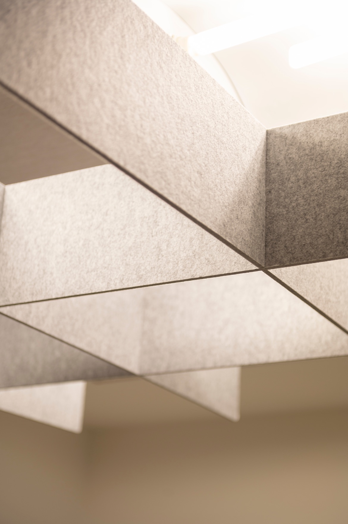 Diesis è una composizione formata da sette lame di Sottofondo Rigido di diverse lunghezze, progettate per incastrarsi tra loro e creare una struttura a griglia sospesa, simile a un soffitto. Realizzate in PET riciclato, le lame contribuiscono alla sostenibilità ambientale. Un elemento distintivo del sistema è la possibilità di integrare fonti luminose tra una lama e l’altra, generando affascinanti giochi di luce che valorizzano l’atmosfera degli spazi.