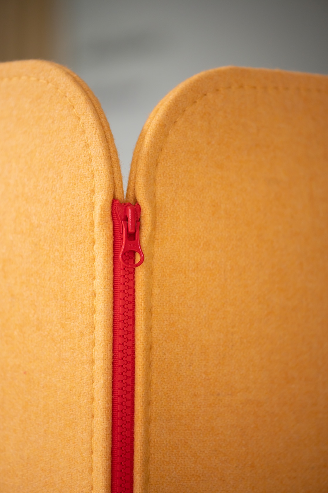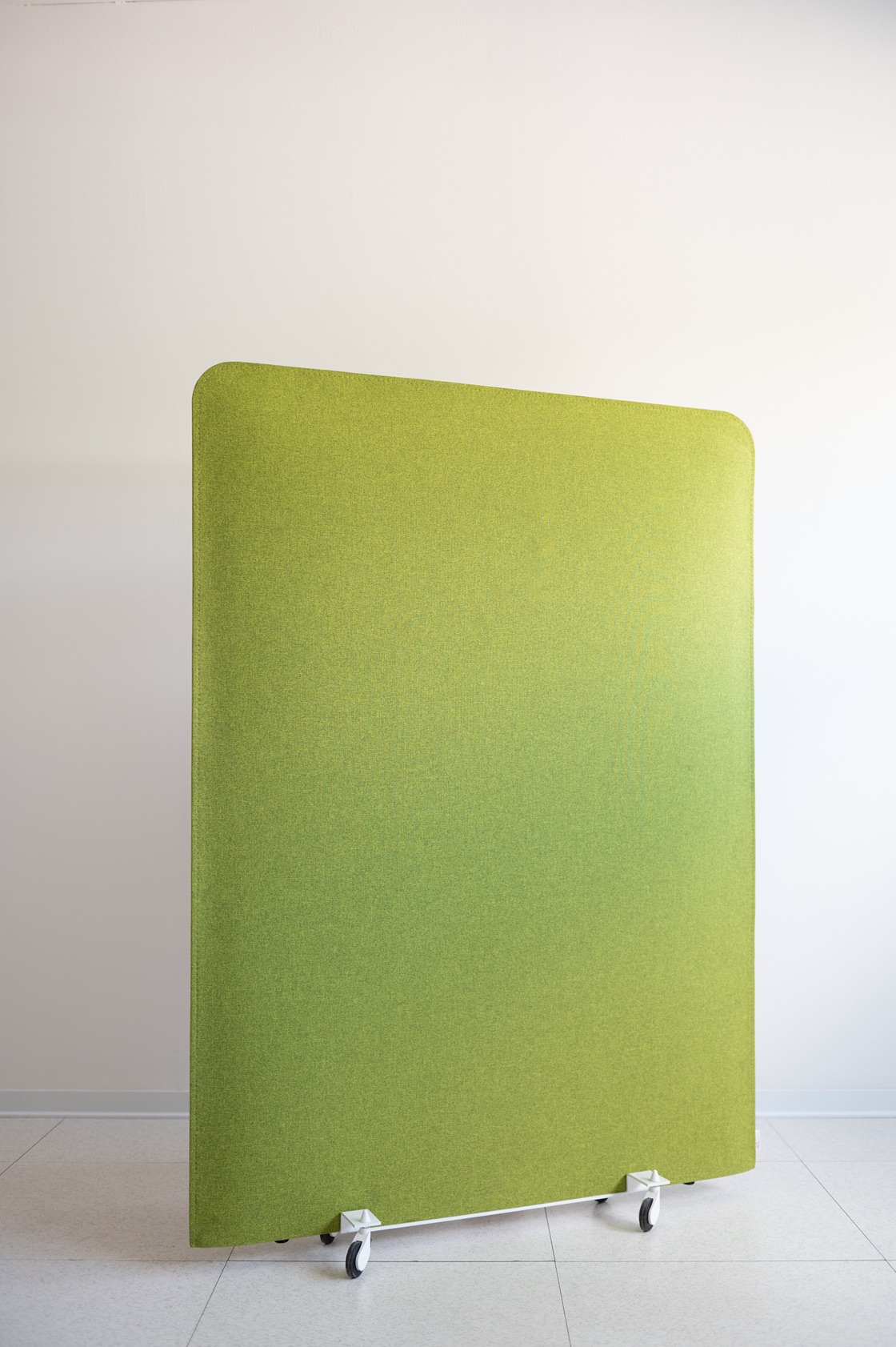 Pannelli fonoassorbenti in fibra in multidensità, di forma rettangolare, con possibilità di aggancio in linea con zip colorate, o utilizzabili singolarmente con una base zavorrata che ne garantisce la stabilità.