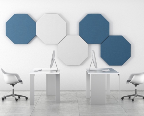 Pannelli fonoassorbenti di forma ottagonale in fibra di poliestere con spessore 5 o 3 cm.