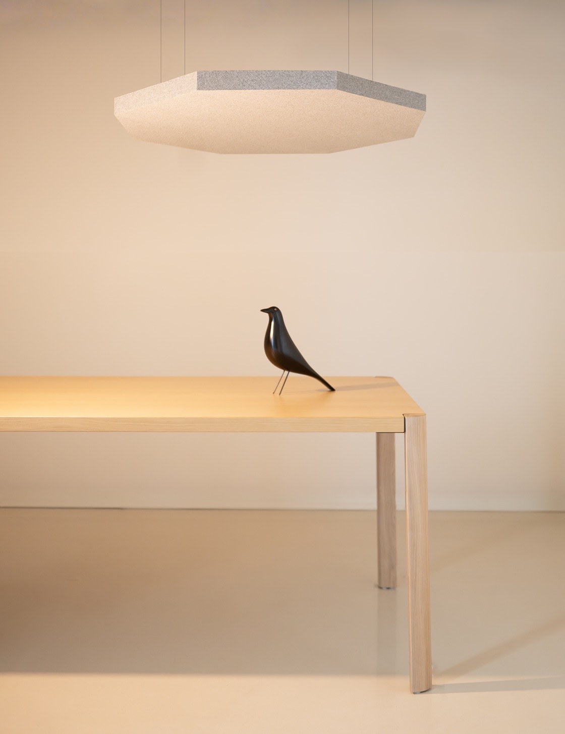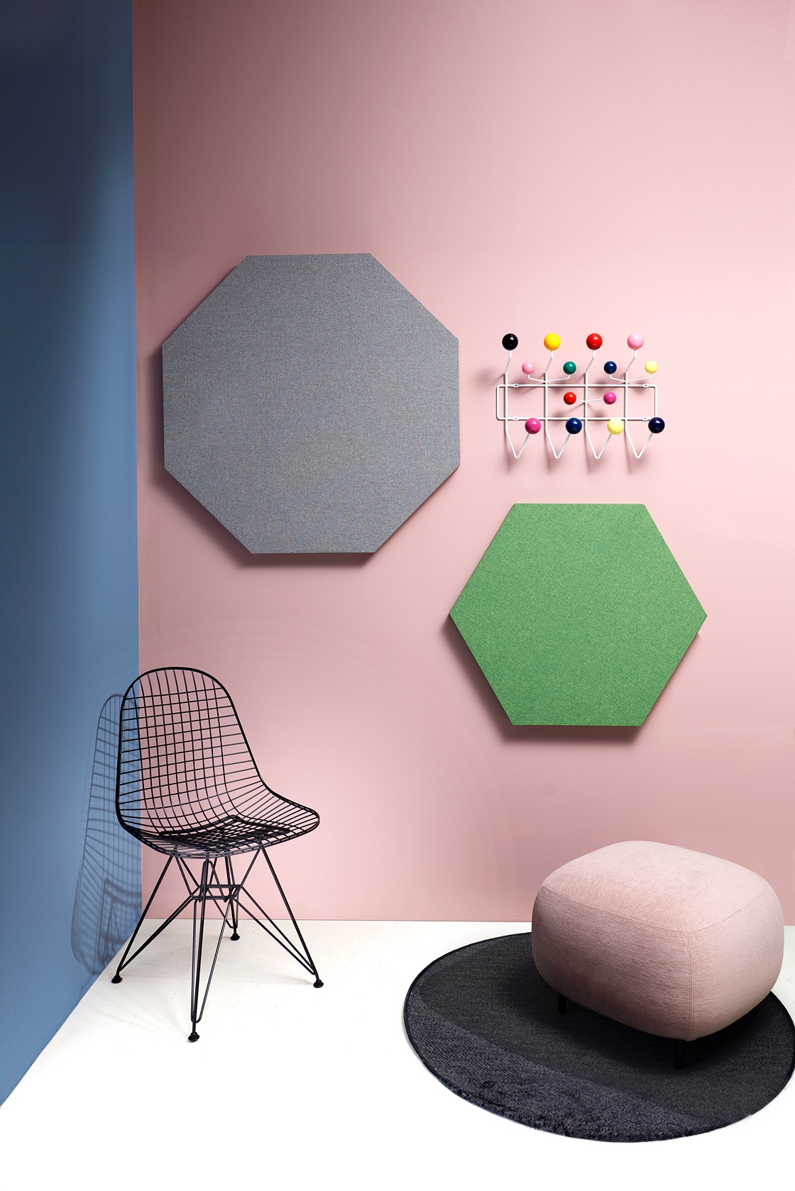 Il pannello Ottava offre diverse tipologie di fissaggio, sia a parete sia a soffitto: possono essere posizionati sul muro a distanze regolari oppure uno vicino all’altro per creare geometrie inaspettate, ma possono essere anche sospesi con cavi o attaccati direttamente al soffitto.