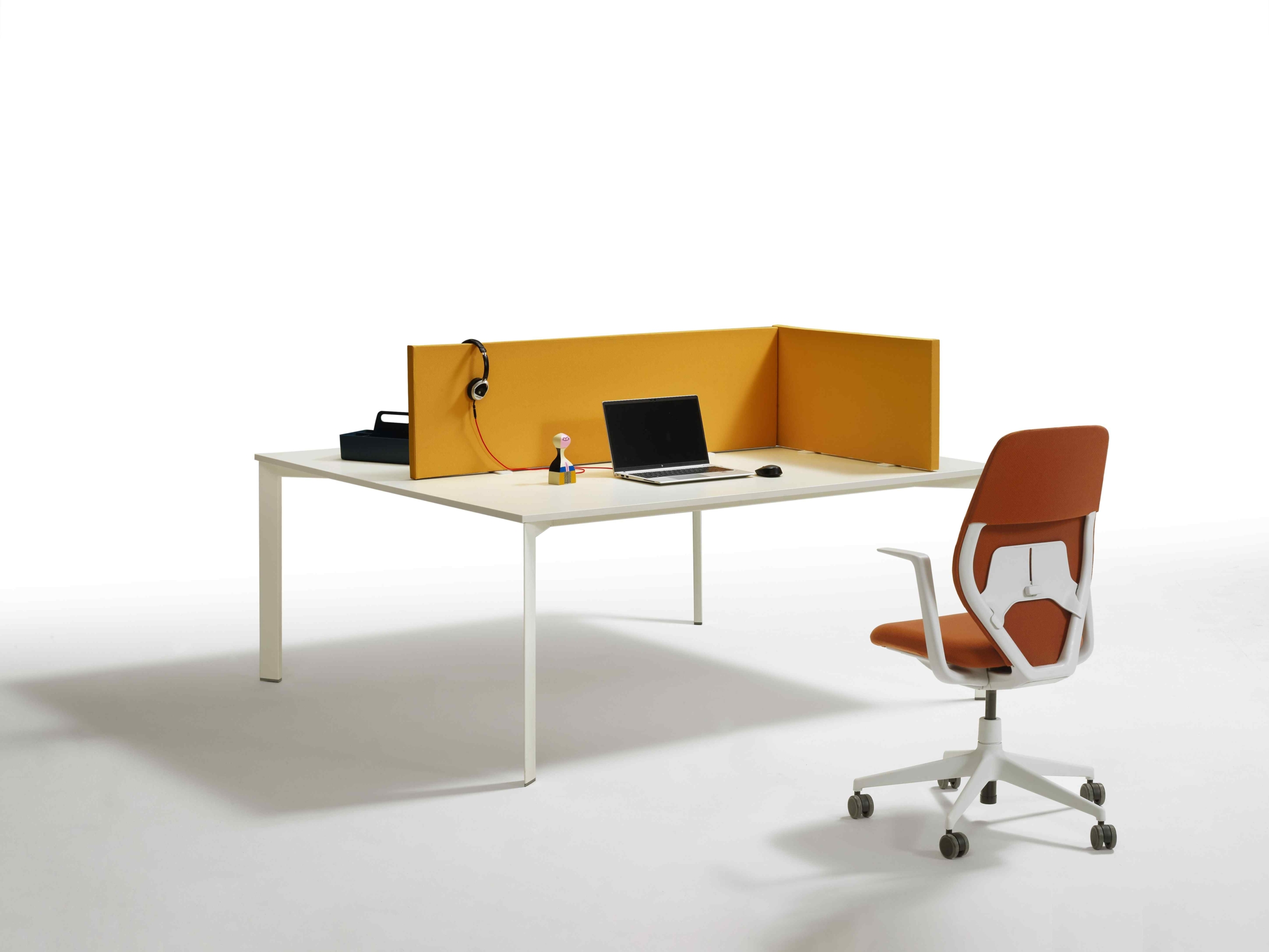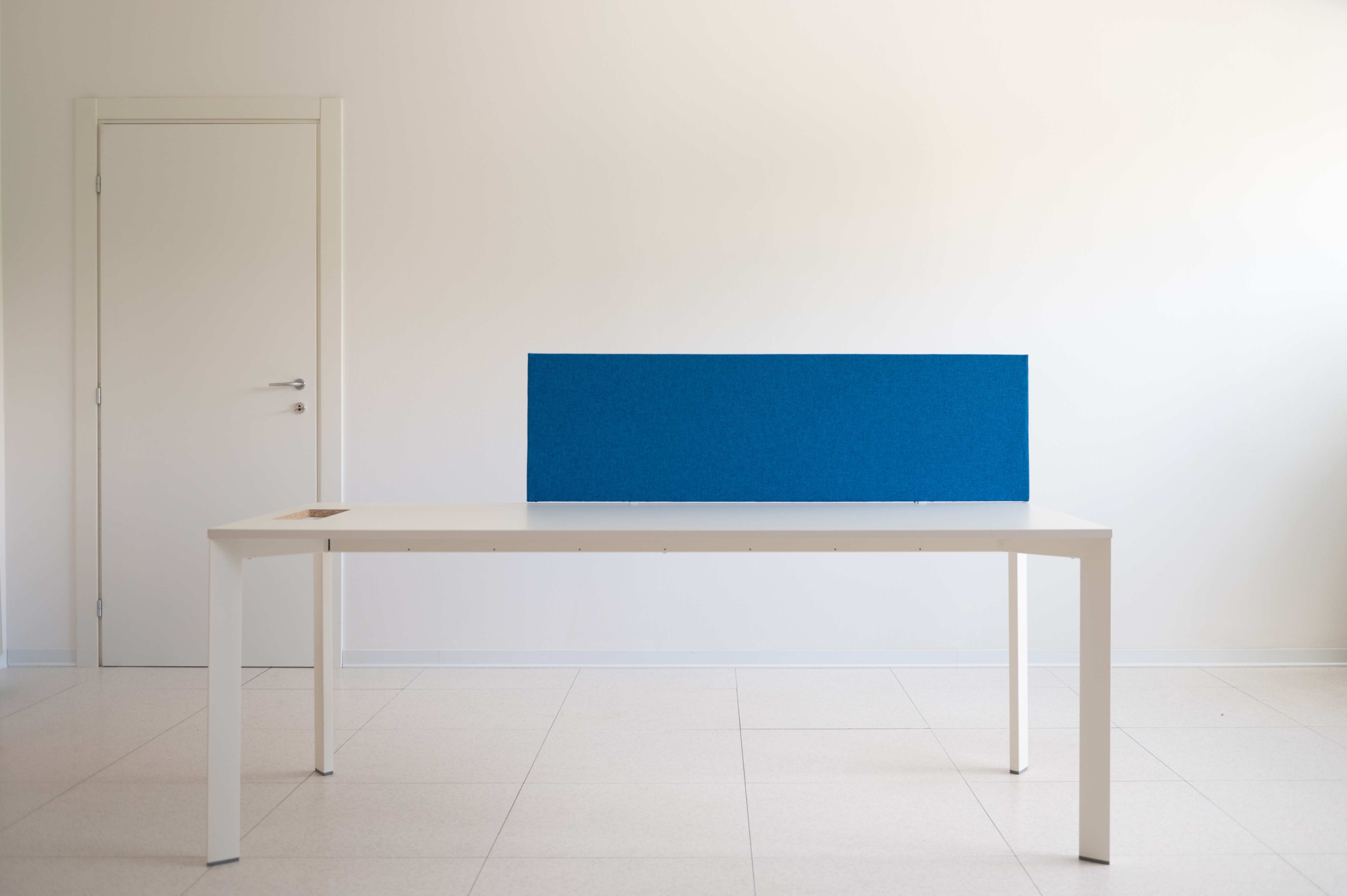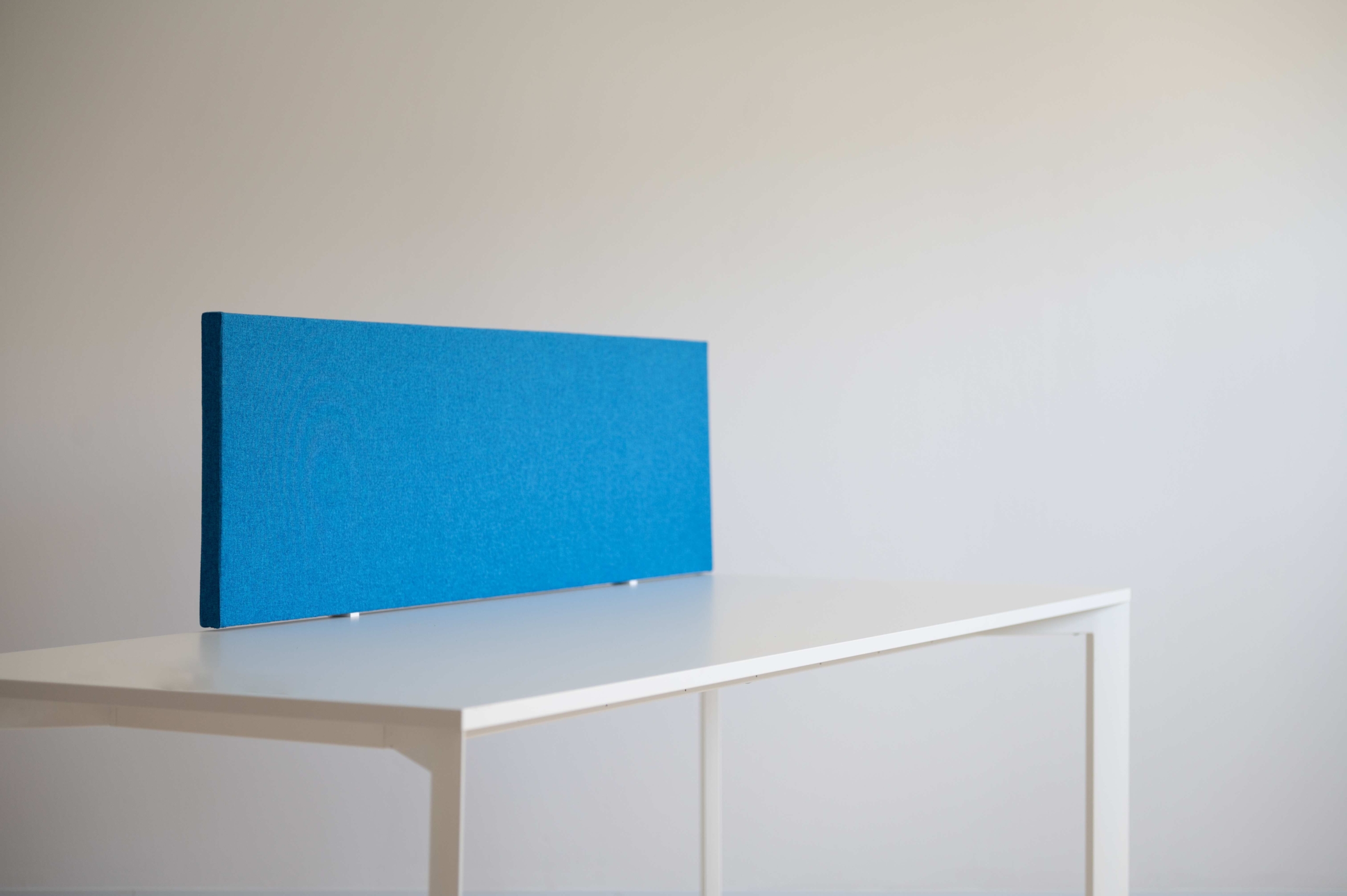 Pannello fonoassorbente per scrivania di forma rettangolare, bifacciale (certificato secondo la norma UNI EN ISO 354), realizzato in fibra di poliestere secondo la tecnologia LVB SINGLE D ACOUSTIC TECHNOLOGY (classe di reazione al fuoco B-s1, d0, secondo la norma UNI EN 13501- 1:2009 – contenuto minimo di fibra riciclata post-consumo: 61%), con varie dimensioni e spessore 30 mm L’interno del pannello è composto da un’anima in fibra di poliestere sp. 30 mm rivestita per le facce ed i bordi a vista da tessuto in classe 0, A o B (a scelta tra una gamma di oltre 150 colori disponibili), solidamente applicato all’imbottitura. La struttura è rinforzata internamente un telaio perimetrale realizzato in Forex.. Il fissaggio a scrivania avviene per mezzo di apposite staffe metalliche verniciate epox sp. 5 mm